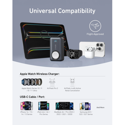 This power bank eliminates the need for multiple chargers by integrating a foldable Apple Watch charging stand and a durable built-in USB-C cable, making it ideal for charging iPhones, Apple Watches, iPads, and even laptops on the go.
