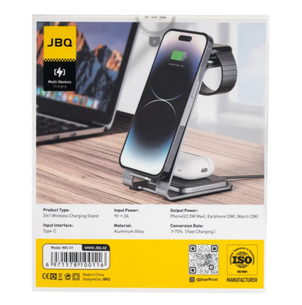 JBQ 3-in-1 Wireless Charging Station – Multi-Device Charger for Phone, Earbuds, and Watch [WIC-01]