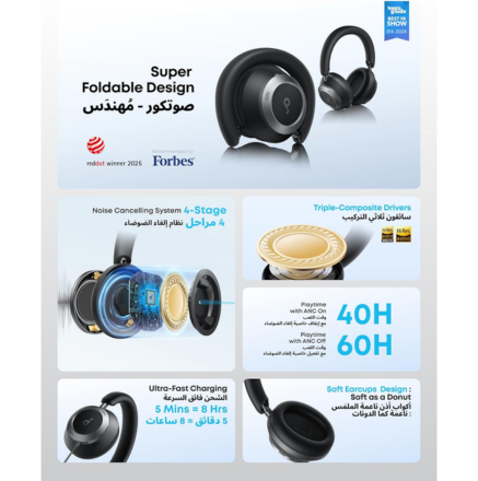 The Soundcore Space One Pro headphones are premium over-ear wireless headphones designed for immersive listening, portability, and advanced noise cancellation. Built with adaptive ANC technology and a unique foldable design, they deliver powerful sound and comfort for travel, work, and daily use.