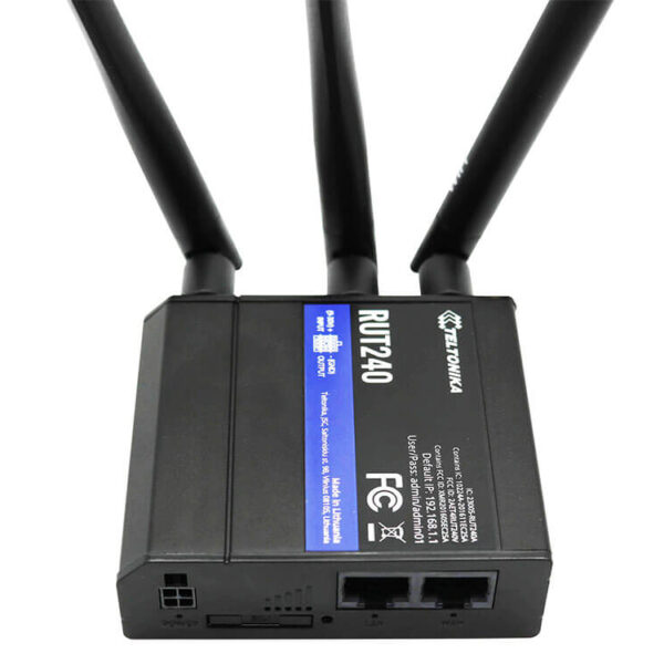 Teltonika Dual SIM 3G/4G M2M router 4G/LTE up to 100 Mbps Download and 50 Mbps Upload EEE 802.11b/g/n WiFi with 2x2 MIMO up to 300 Mbps Four Ethernet ports Durable aluminum housing Dimensions : 50 mm x 100 mm x 110 mm (H x W x D) , Weight : 280 g