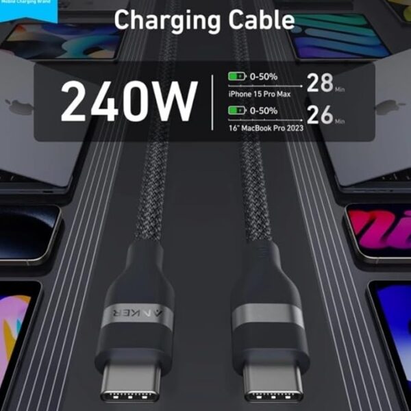 The Anker USB-C to USB-C 240W Upcycled-Braided cable is a high-speed, durable charging cable made from recycled materials, supporting ultra-fast 240W power delivery with a flexible, tangle-free braided design built for long-term everyday use.
